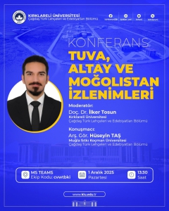 ![]() | TUVA, ALTAY, MOĞOLİSTAN İZLENİMLERİ KONFERANSI GERÇEKLEŞTİRİLDİ. Fen Edebiyat Fakültesi - Çağdaş Türk Lehçeleri ve Edebiyatları Bölümü 02/12/2025 101 Okunma Muğla Sıtkı Koçman Üniversitesi, Çağdaş Türk Lehçeleri ve Edebiyatları Araştırma Görevlisi... |